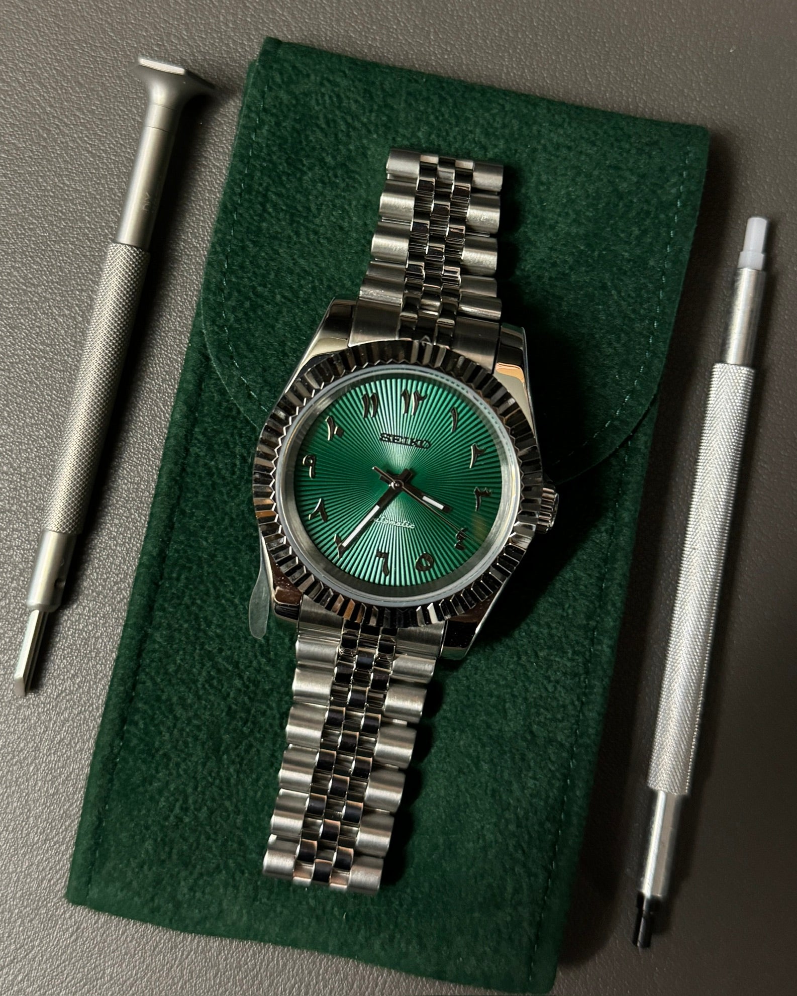 - NH35 movement w/ quickset date, seconds hacking, 41+ hour power reserve